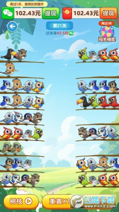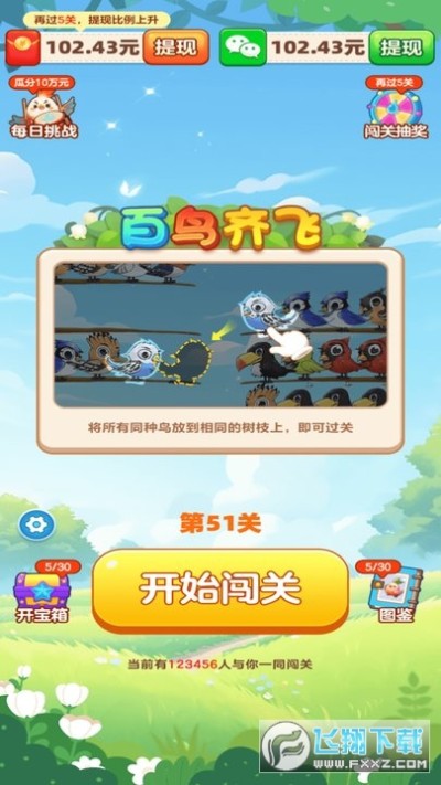 百鸟齐飞赚钱游戏是一款以排序为主题的休闲闯关游戏,超多可爱小鸟消除闯关,玩家通过点击屏幕控制小鸟跳跃,游戏还会有多种不同的关卡等你来挑战,游戏场景设计丰富多样,当达到对应的排序要求即可拥有大量的红包奖励,还可以与其他玩家进行实时对战。