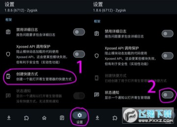 5.在设置中找到1【创建快捷方式】,然后将2【状态通知】关闭;