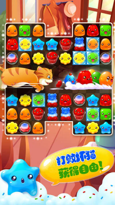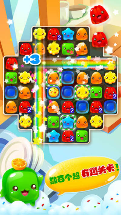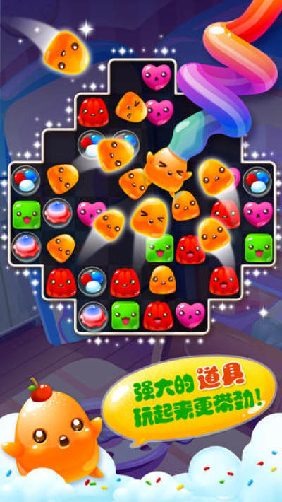 色彩鲜艳的各式果冻,给您赏心悦目的消除体验。传统模式易于上手,精巧关卡设计等您挑战。爽快消除给您欢乐,强力道具让您不再苦恼。上百个关卡给您不同的欢乐体验。