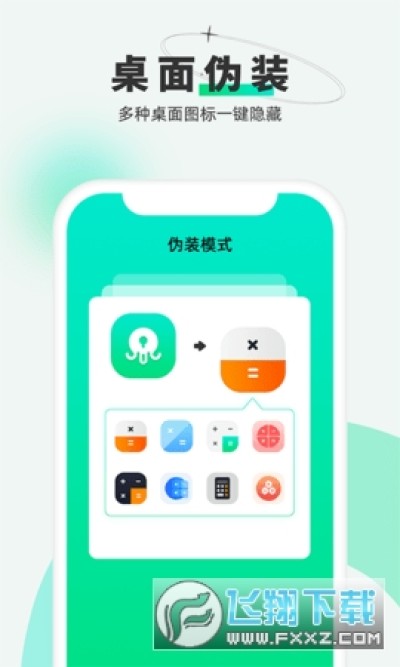 1、图标伪装:一键更换桌面图标,将图标伪装成计算器样式,并具有计算器功能,打开不被发现。