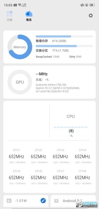 主要提供功能和概览两大模块。功能模块包括帧率记录、充电统计、耗电统计、应用管理等。概览模块则可查看手机的内存、CPU运行情况、电量、温度等信息。