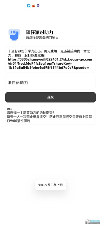 1、每名玩家需点击助力3次之后,才能提交自己的助力链接。