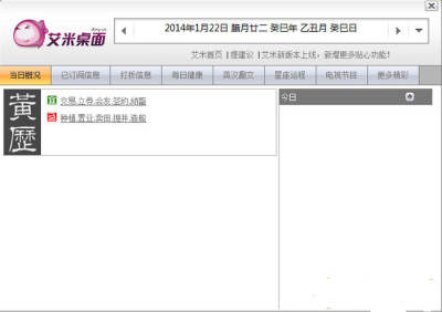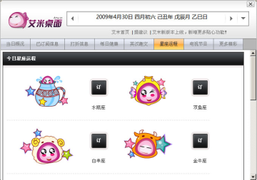 艾米桌面最具特色的功能就是信息定制功能,用户可以自由定制自己需要的信息服务,比如一些打折商品,体育赛事,以及一些电视节目和星座运势,应有尽有,真正做到了足不出户尽知天下事的境界。