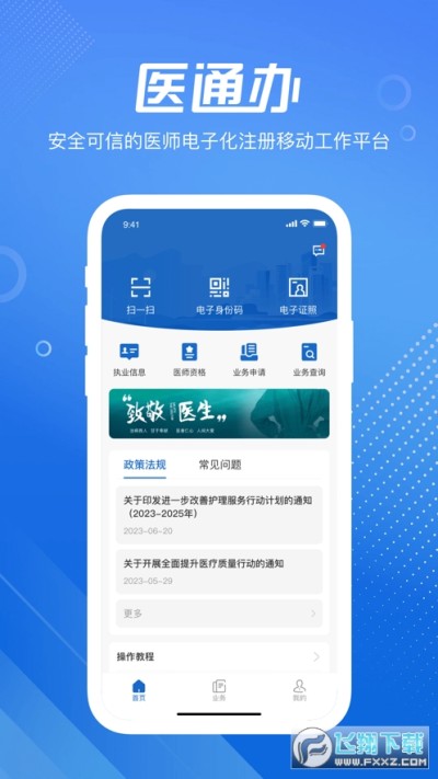 医通办APP是医师电子化注册移动工作平台,基于安全可信技术实现医师精准管理。为全国医师提供电子化注册的实名、实人认证服务、状态变更实时查看;围绕医师电子化注册业务办理、科室维护、基本信息查看和信息发布平台;扫码、亮码、出示电子证照等服务。