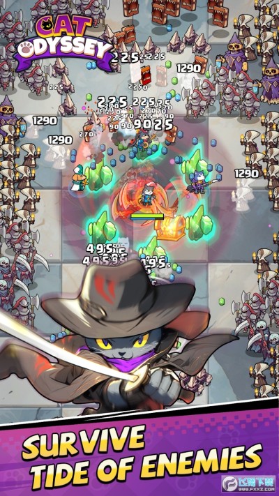 3、通过可爱的猫咪形象和割草射击玩法,给玩家带来全新的游戏体验。 该游戏融合了 Roguelike 元素。