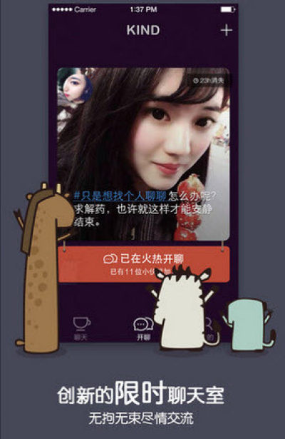 KIND是一款LBS(基于位置的服务)的陌生人限时聊天交友移动软件。在KIND中一张图+一句话即可创建一个聊天室,分享任何你感兴趣的话题。当然也可以加入附近已被创建的聊天室,捕获同类。 当你发现自己的同好,兴趣无人分享时,发布或加入“秒聚”聊天室,共同兴趣,喜逢知己。 当你捕捉到某个时刻,周围却找不到共鸣时,开启“秒聚”话题聊天室,世界之大,总有人分享你的喜悦、惊讶或悲伤。 当你发现一家好店,朋友圈却无人回应时,“秒聚”一下,从陌生到熟悉,一顿饭,一场电影足矣。