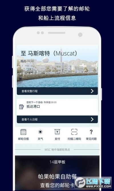 我的msc地中海邮轮是一款邮轮移动服务平台,通过这款软件将为用户开启邮轮之旅,可以在软件里查看游轮上的各种信息,所有的功能都为您定制,让您的航程安心愉悦,在这里让大家自由预订船票,帮助您在整个航程中充分享受各种服务和活动,让您的航程舒心愉快。