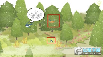 点击地上红框处的小燕子,接着在左下物品栏拖动“小燕子”给红框处的鸟,成功帮助到了燕子妈妈。获得了“燕子羽毛”。