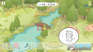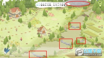 根据图腾需要燕子鸡鱼的羽毛,燕子在游戏开头我们就获得了;鸡的位置在场景最左下红框处,多点两下可获得鸡尾毛;最后鱼鳞,放大屏幕点击河里红框下的鱼获得鱼鳞。