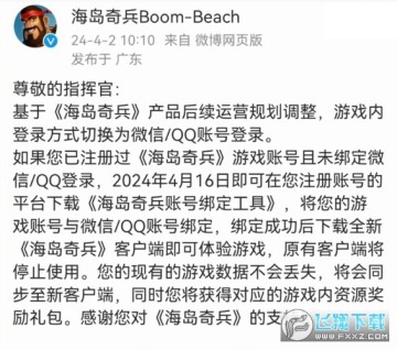 如果您已注册过《海岛奇兵》游戏账号且未绑定微信/QQ登录,2024年4月16日即可在您注册账号的平台下载《海岛奇兵账号绑定工具》,将您的游戏账号与微信/QQ账号绑定,绑定成功后下载全新