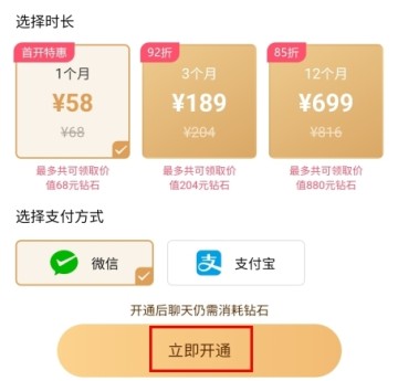 3、选择套餐以及支付方式,点击立即开通按钮;