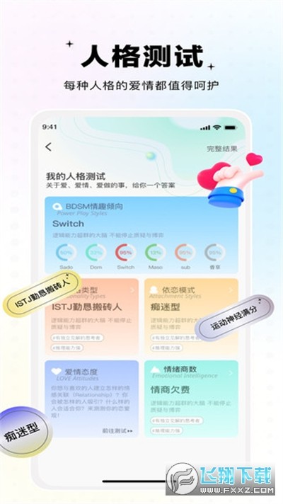 【平台特色】本平台是基于人格测试和属性测试设计的新型社交app,通过测试出的各项指标进行交友匹配,致力于打造一个“走在社交前沿的社交平台”
