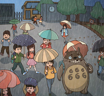 1、靠近校门的两个人,在雨中狂奔,但是牵着手,点击他们的手就可以了。