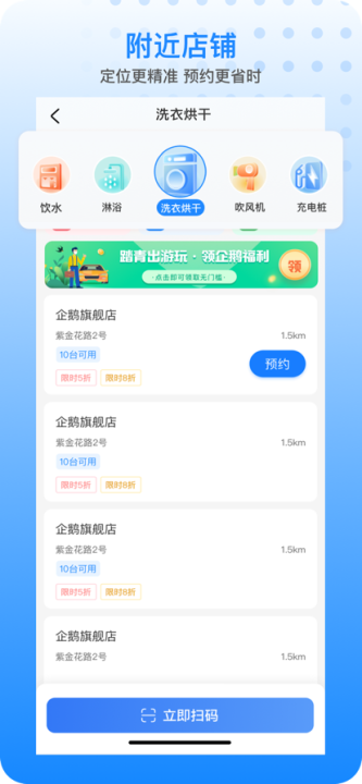 二、选择附近设备地点,导航到店后点击立即扫码,并扫描设备上的二维码后即可使用设备