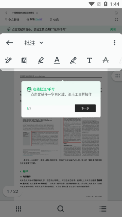 2、通过点击文献任一空白区域,用户可以调出工具栏进行操作,提升阅读效率。
