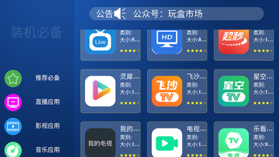 玩盒市场APP一款可以安装在电视端使用的应用商店大全APP,软件中提供的都是可以直接下载安装在电视端使用的应用,无论是系统工具还是影视大全,还是工具助手,这里都有提供,而且都是免费的哦。