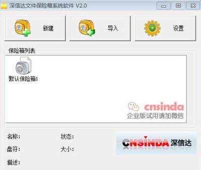 深信达文件保险箱是一款功能强大的文件加密工具,采用高度安全保护系统的加密技术,无论是个人的隐私资料,个人编写的源代码,设计的图纸,安全文档,还是个人的照片,视频,或者小账本,都可以放心的放到保险箱中。