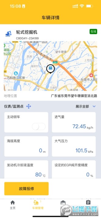 进入对应的车辆详情界面中,您可以实时查看设备的工作时长、油量以及各种运行状态参数,并且能够实现远程锁车功能,界面中的运行参数可以按照您的习惯自定义排序,并选择是否展示在车辆管理界面中。