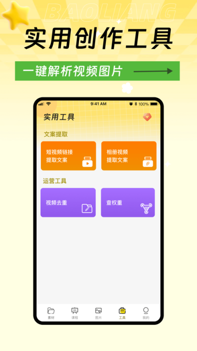 爆量素材是每位短视频内容创作者、达人和视频编辑者的理想选择。它集成了高清无水印的视频素材库,炫酷特效,多样化的背景音乐,以及创意文案模板。更有多种实用工具,如提取视频、提取文案、保存高清视频和音频等,极大地丰富了您的创作可能性。