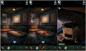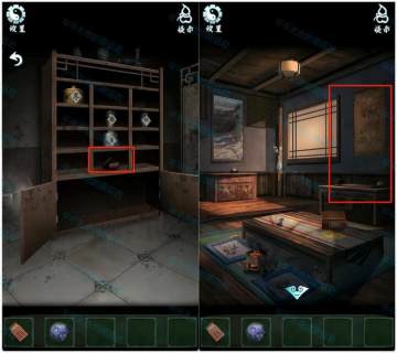 六、然后要钥匙打开茶房,点击第一张图屏风位置,获得密码【3957】打开下图柜子的密码,获得木炭,再点击中间图位置的图片位置,或者密码【左右左左右左】,解开福字的门锁,获得【茶宠】,茶宠,是放入倒满水的被子中