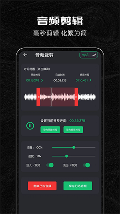 1、 音频剪切:本地音乐库,自定义音频裁剪范围,剪出你要的特别精彩;