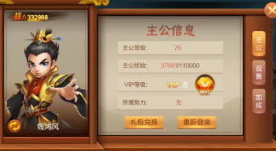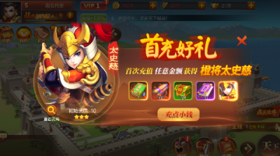 上线福利:VIP1、19w元宝、50w粮草、100w铜钱