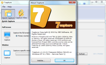 7capture一款专门支持圆角截图 和 清除窗口背景的截图工具,7capture功能上比较简单,只有全屏截图 和 窗口截图,唯一亮点 支持圆角截图和去除背景,Win7/vista 的Aero毛玻璃界面,普通截图窗口四周会出现缺陷,用7capture可以解决这个问题,同时 7capture免费,单个文件而已!
