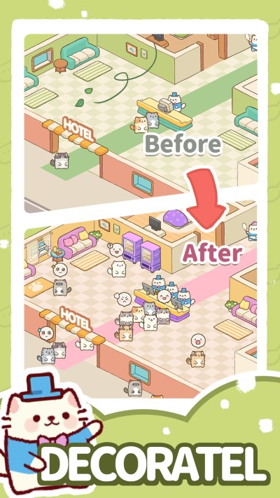 玩家需要照顾酒店里每个可爱猫咪,保证它们的衣食住行,提高服务质量,吸引更多可爱的猫咪前来入住。