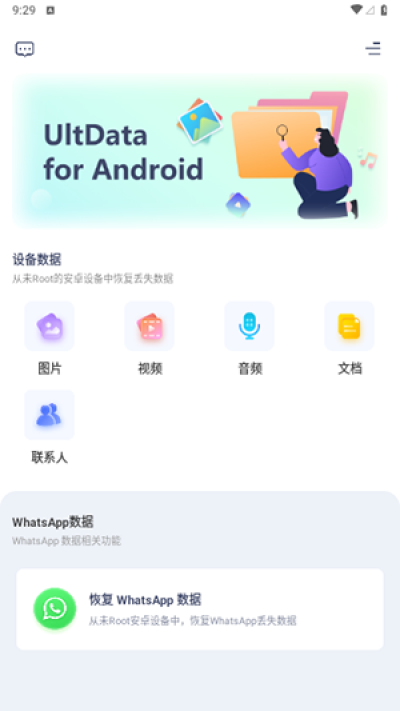 UltDataAPP一款安卓端数据恢复软件,它无广告无推送,免费纯净,只给你最极致的数据恢复体验。它支持恢复手机中的图片、视频、音频、文档、联系人,每当您删除上述类型的数据时,都可以使用此应用程序立即恢复它们,无需root。