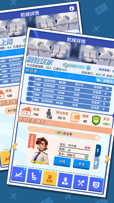 游戏设计上百位机长、空姐可供招募,安排合适的执飞航线,能提升技术和服务水平。每个航班完成后,乘客会对航行体验做出评价,随时关注评价并做出针对性的改善。