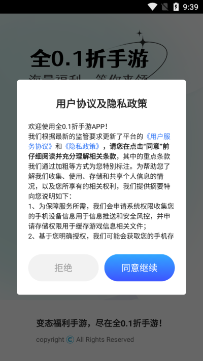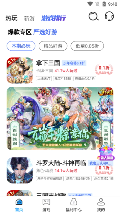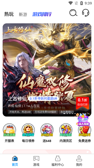 全0.1折手游app是一款安卓手游折扣平台,平台中内含海量的优质游戏资源,包含不同的游戏类型以及折扣版本,用户还可以随时随地领取新人礼包奖励,每天都会为你推荐热门游戏榜单,对软件感兴趣的话不妨点击下载试试!
