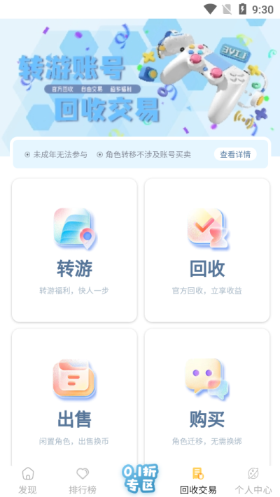 六一游趣app是一款安卓手机游戏交易平台,软件中有着海量的实用功能等你体验,包含上千种热门手机游戏自由交易体验,官方回收游戏账号,玩家之间可以自由进行交易,超多福利等你领取,对软件感兴趣的话不妨点击下载试试!