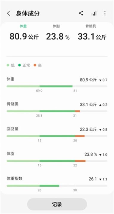 测量完成后,查看您的身体成分结果。您可以在手机上跟踪数据的变化。