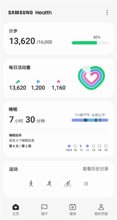 睡眠监测:通过Galaxy Watch等可穿戴设备更详细地监测睡眠模式,提供睡眠水平和睡眠得分,帮助您提升睡眠质量。