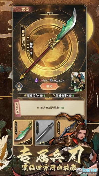 2. 武器养成系统:玩家可以根据已经抽到的武器,对其进行精粹(进阶)、强化(升级)、分解武器(换为武器升级道具)三个操作。每个武器都具有自己的独特效果,武器与武将角色的搭配可以让数值达到不同的上限,也为玩家构筑的不同流派提供不同的助力。