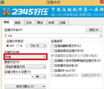 3、点击压缩方式下拉列表框,在弹出的下拉列表中选择”存储“,然后点击确定