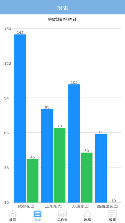 自动生成报表,这里以柱状图的图形显示了每一件报事的完成情况以及完成进度