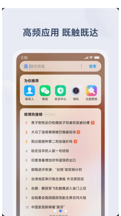 这是专为小米用户打造的桌面全局搜索工具,通过搜索引擎你可以快速搜索找到你想要的本机安装的应用,搜索你需要的文件,查找你想要的其他内容,同时你还可以通过搜索查看实时新闻资讯,查看软件实用教程。非常的方便实用,需要搜索工具的用户可以下载!