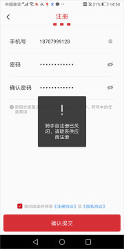 2、但是当用户填写好信息提交后会提示骑手自己不能自己注册,需要联系供应商