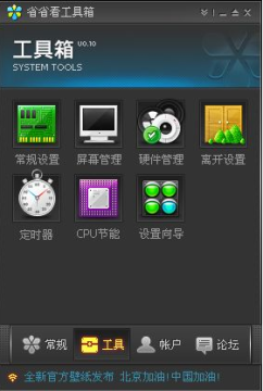 全新省省看工具箱提供一系列小工具,可以方便的调节显示器亮度;轻松关闭不常用的硬件设备(蓝牙,光驱等)节省电能消耗;让电脑在指定的时间开始下载或运行特定软件,定时自动关机等。还有更多方便智能的工具正在开发中,以后会逐步加入工具箱。