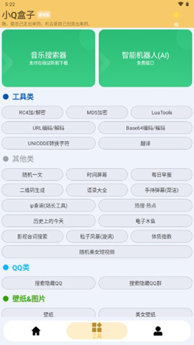 小q盒子app是一款安卓手机实用工具箱软件,软件界面简洁直观,所有功能一目了然,用户可以根据自己的需要进行选择体验,包含ai智能机器人以及音乐搜索器等,对软件感兴趣的话不妨点击下载试试!