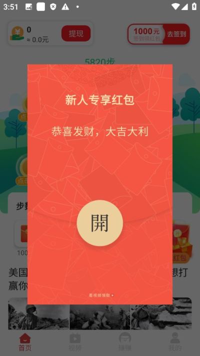 这款游戏和微分视界的资讯类版本有点相似,但是没有那么爽快,需要看一两个视频才能提。登录后领取一个新人红包,应该是固定给0.2的,这个红包后续可以凑够0.3提现。另外新人登录可以直接提一次,和微分的一样,随机给。有时间的话可以去赚赚版块看一些视频,凑够3000金币可提。
