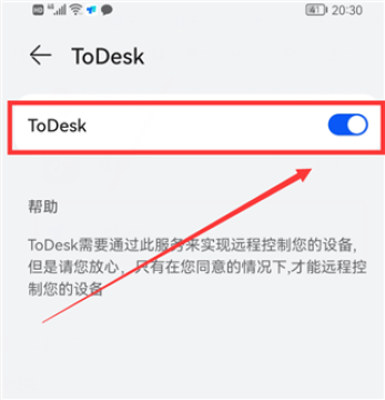 点击ToDesk选项右侧的开关,然后把它的开关打开,变成蓝色(如下图)。另一部手机就设置好了。