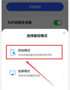 点击“允许远程本设备”右侧的开关,这时底部会弹出“选择被控模式”弹窗(如下图)。