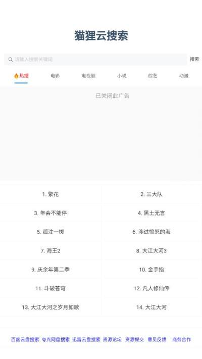 狸猫云搜索maoliyun.com/是一个集免费搜索电影、电视剧、小说、综艺、游戏、动漫等热门热搜资源的网盘搜索神器,注意,这其实是一个网页站,这里是打包的apk,大家也可以直接根据官网在官网操作,选择下方的网盘,资源都是需要在网盘里面下载打开的。