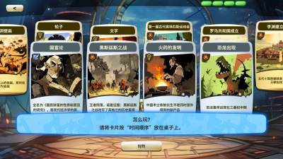 2、具体玩法就是玩家手里的历史牌要按年代先后顺序插入桌上现有的事件卡队列里...