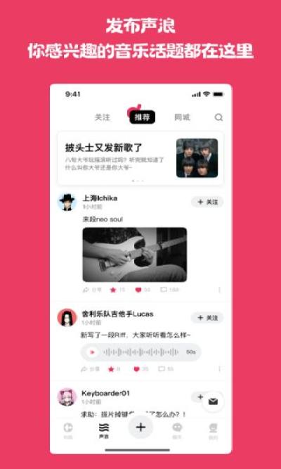 奏浪app是一款手机音乐交友软件,在这里你可以选择你的音乐标签,快速即可了解音乐相关的知识内容,海量的实用功能等你体验,还可以搜索心仪的歌曲在线聆听!对软件感兴趣的话不妨点击下载试试!