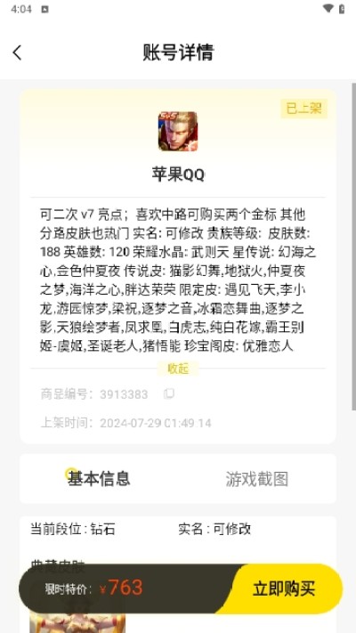 321买号吧APP中所提供给大家的手机游戏账号交易服务是非常可靠的,所有游戏账号信息都是非常详细真实的,大家可以放心的来这里进行使用,带给大家的游戏账号交易服务是非常可靠的,同时提供折扣充值等特色服务.