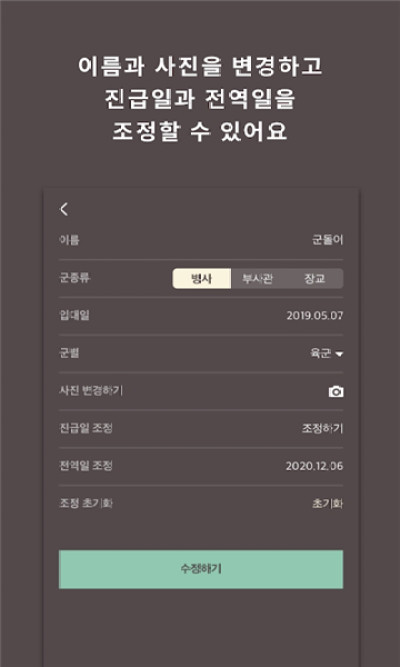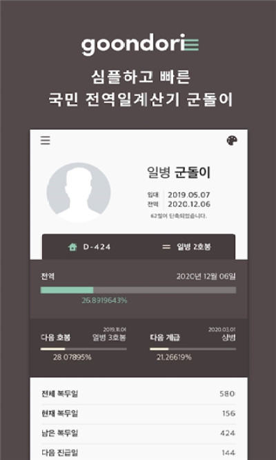 《Goondori中文版》是一款由Holy Kiwi研发制作的针对粉丝们追星而准备的追星神器!有一个特别优秀的功能就是,大家可以在这里查到你们的明星偶像服兵役和退伍的时间,这样可以保证你们更准确追星!可以自行调整开始日期,上面的时间是实时变化的。用户可以计算和记录在韩国服役的家人、朋友和偶像的服役时间。主打的是简单易懂的界面风格,并支持多人观看数据!