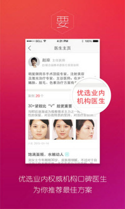 樱桃帮严格甄选100多家医学美容机构,优选业内权威机构和口碑医生,用户自发分享变美真实案例,案例直观展示,让你放心安全的迅速变美。樱桃帮坚持只推荐对的机构,好的产品给到客户,樱桃帮永远是你身边最放心的医学美容顾问。